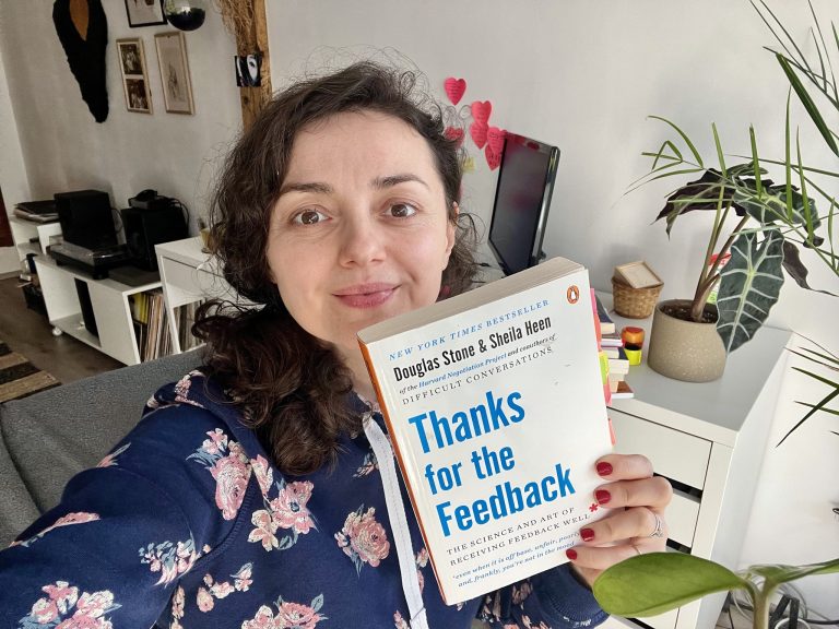 Sunt foarte recunoscătoare pentru ziua de ieri și exercițiile făcute alături de colegii mei, mai ales pentru că mi-au adus aminte cu drag de cartea asta – Thank for the Feedback de Douglas Stone & Sheila Heen – pe care am citit-o în 2022 și care m-a inspirat și în alte rânduri să scriu, deoarece nu cred că o să fie vreodată prea multă informație despre cum e să oferim, dar mai ales cum e să primim feedback.